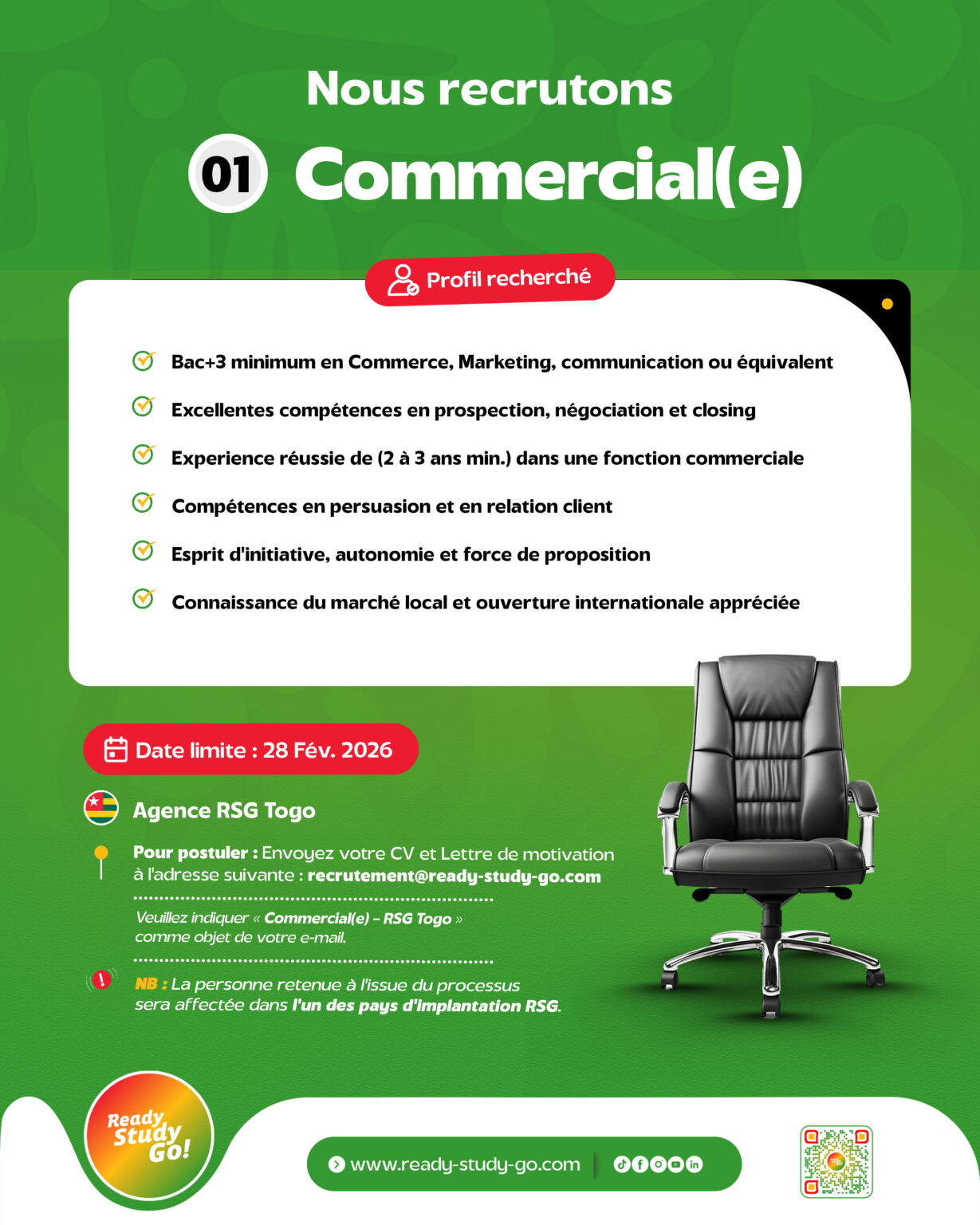 Dans le cadre du renforcement de son équipe, Ready Study Go (RSG) recherche un(e) Commercial(e) dynamique, orienté(e) résultats et passionné(e)